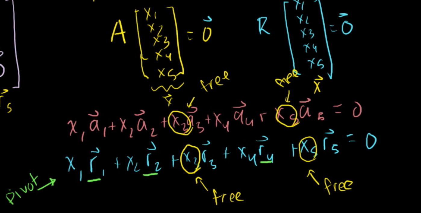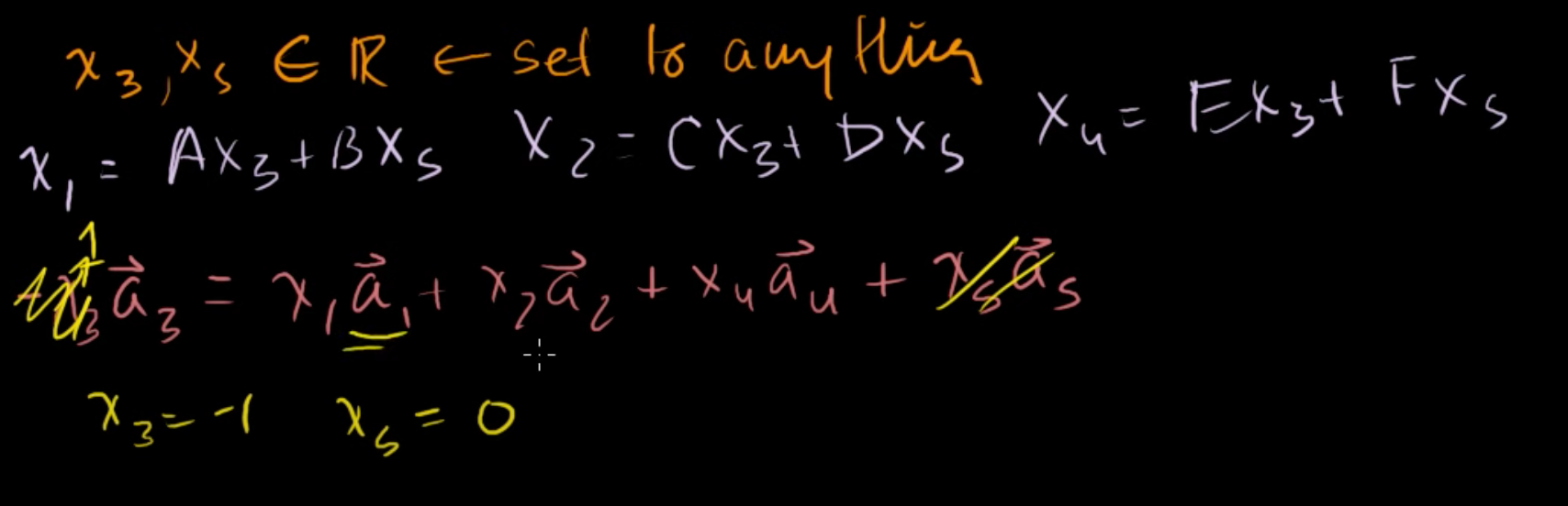 x1 a1 + x2 a2 + x3 a3 + x4 a4 + x5 a5 = 0 을 자유벡터를 다른 피봇 열의 벡터들의 선형결합식으로 표현해보면,