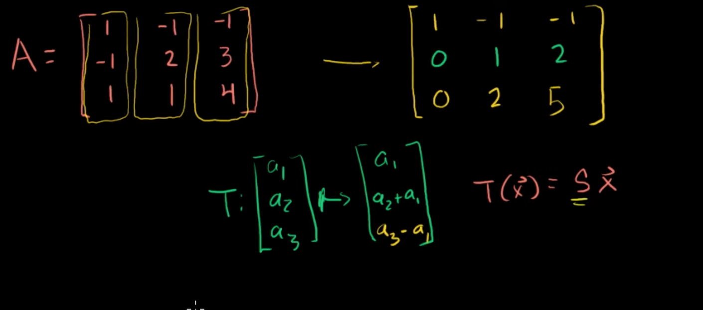 이 과정을 표현해보면, T[a1, a2, a3] 였던 식이 T[a1, a2+a1, a3-a1]이 된 것과 같다.