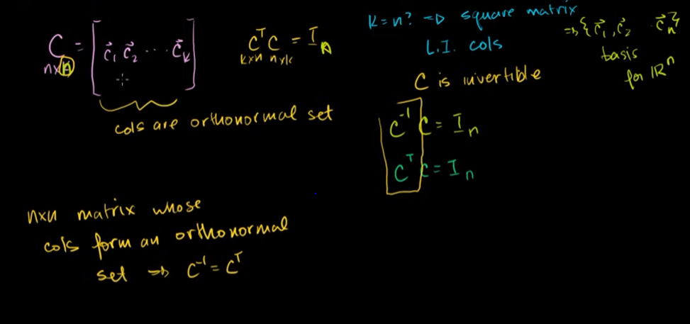결론적으로, n x n 행렬의 열들이 정규직교집합을 형성한다면, C-1 = CT 이다.
