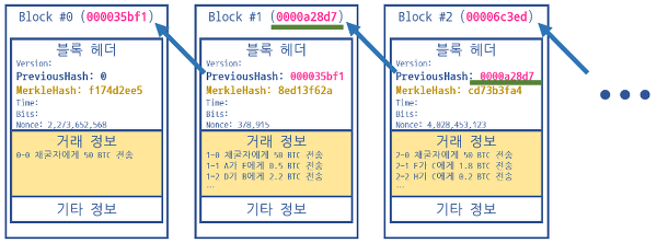 앞 블록의 요약(해쉬값)이 뒷 블록에 포함되기 때문에, 앞 블록의 내용을 변경하면 뒤에 이어지는 모든 블록들의 내용이 변경되어야 한다.