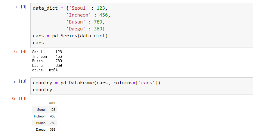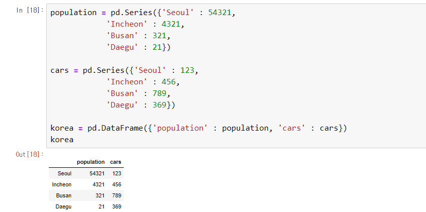 2) 다수의 Series를 이용해 만들 때는 딕셔너리처럼 생성하면 된다.