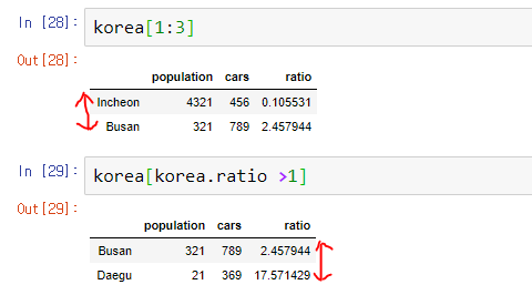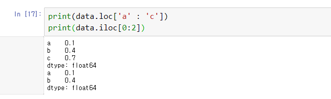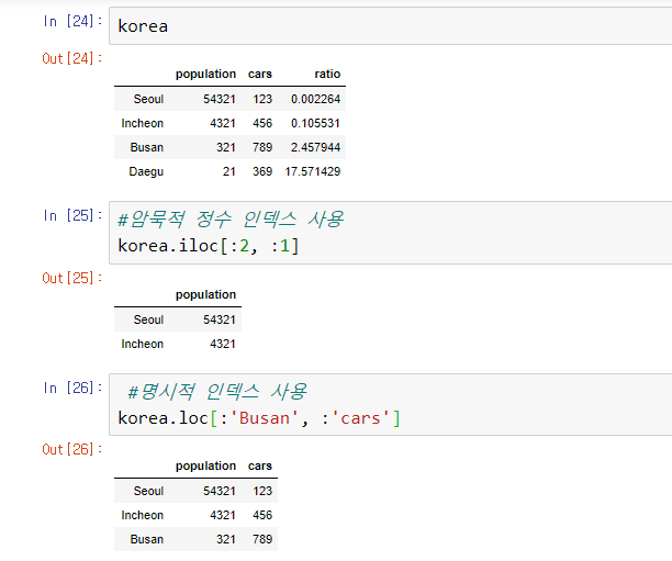명시 슬라이싱과 암묵 슬라이싱때문에 혼동이 발생할 수 있기 때문에 loc, iloc를 주로 사용한다.