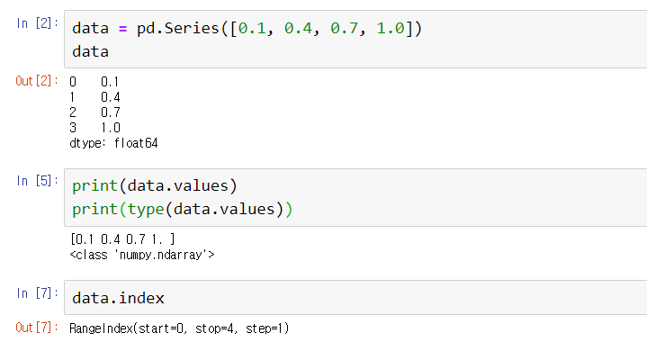 numpy배열이며, 값은 values로 인덱스는 index로 접근할 수 있다.