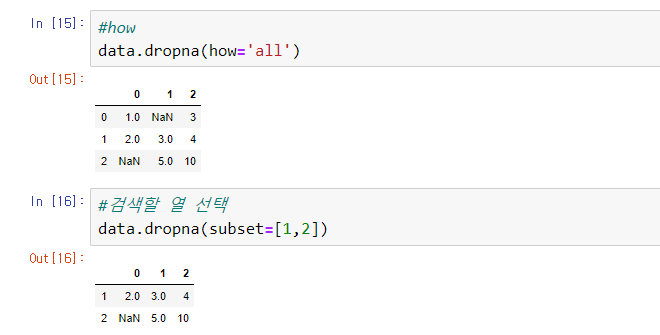 NA값을 검색할 열을 설정. ex) subset = ['name', 'age'] 이면 name과 age열에서만 NA검색