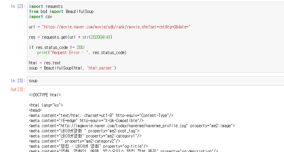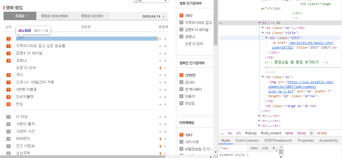 예제로 만든 코드는 네이버 영화에서 영화 순위, 이름, 변동여부, 변동등수를 가져오는 코드입니다.