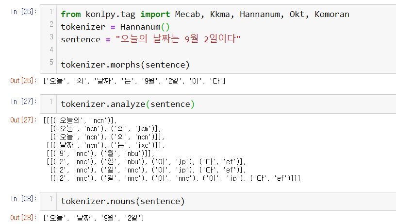 morphs = 형태소, analyze = 형태소 가능한 경우의 수, noun = 명사, pos 형태소 + 품사