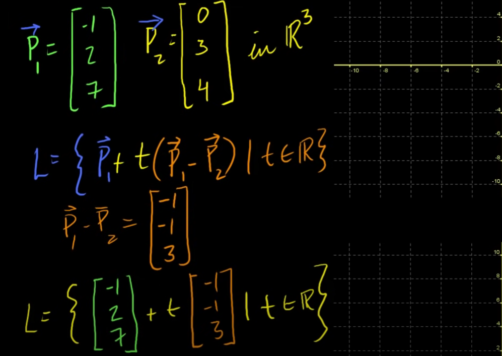 3차원 좌표에 존재하는 p1과 p2를 정의하고, 이 두 벡터를 지나는 직선을 구하려면 L과 같이 식을 세우면 된다.