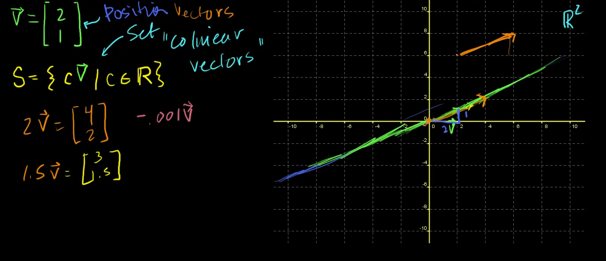 벡터 V가 (2,1)이고, S라는 집합이 실수 스칼라 c와 벡터 V의 곱으로 이뤄진 집합이라면 위와 같이 좌표에 그려질 수 있다.