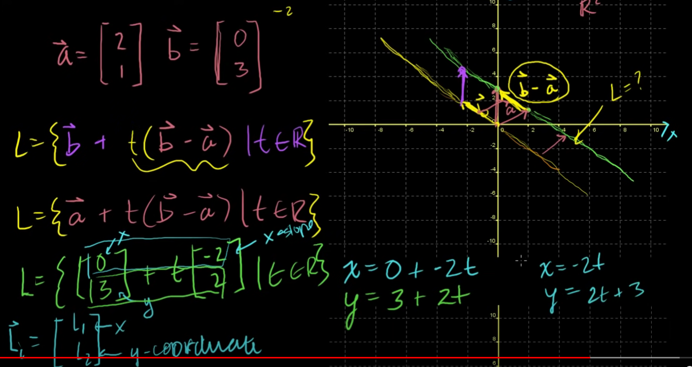 벡터 a와 b를 L에 대입해서 풀어보면, 초록색 식이 나오는데, x에 대한 식과 y에 대한 식으로 풀어보면