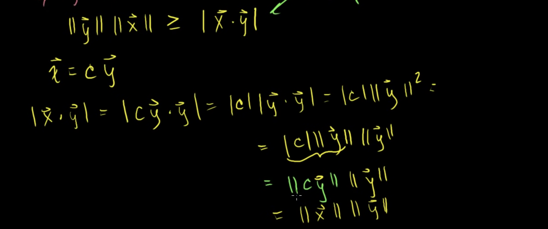 |c × y·y| = |c| × |y·y| = |c| × ||y||² = |c| × ||y|| x ||y|| = ||cy|| x ||y|| = ||x|| x ||y|| 이 된다.