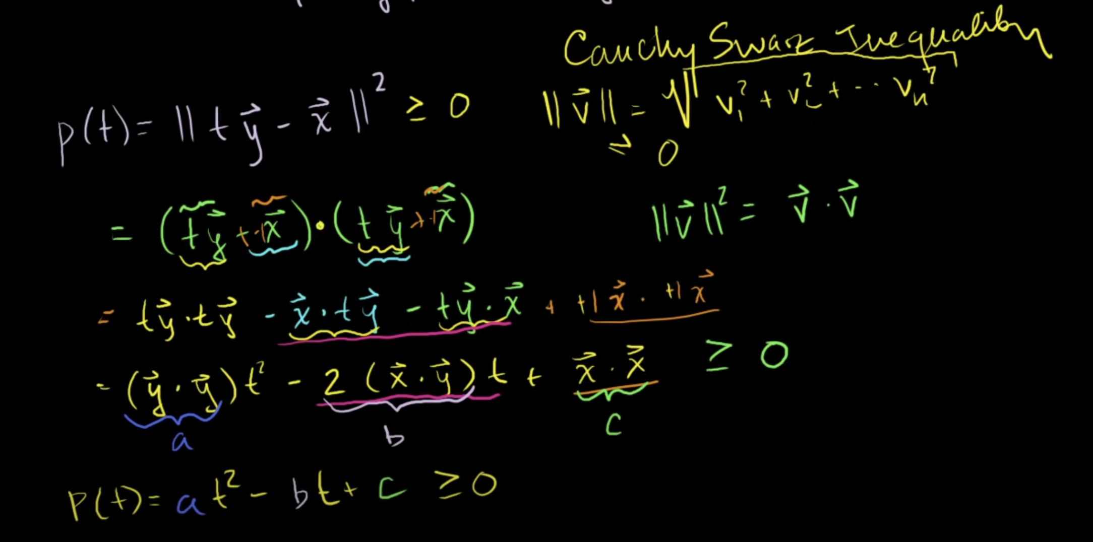 교환법칙과 결합법칙을 이용하여 식을 다시 한 번 써보면, (y·y)t² - 2(x · y)t + x · x가 된다.