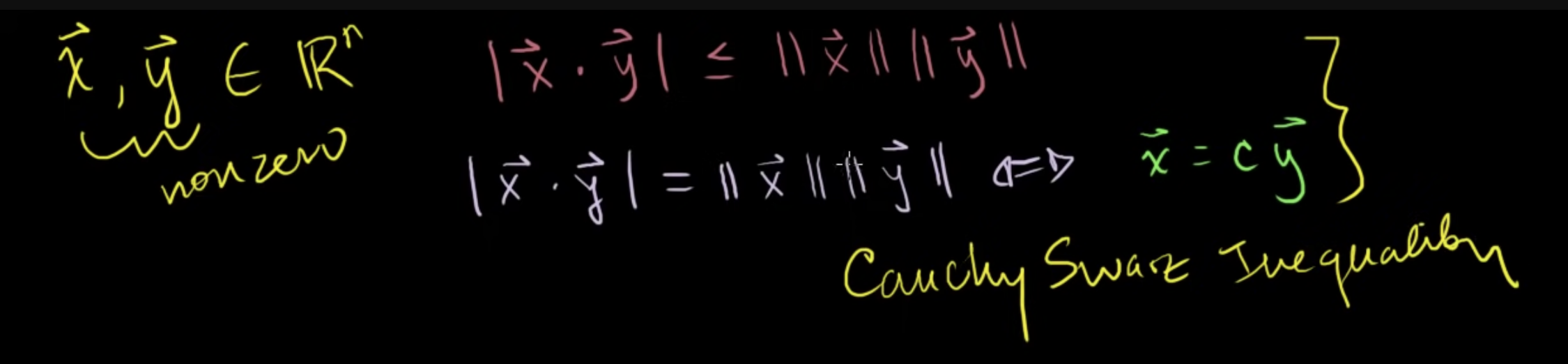 두 벡터를 내적한 값의 절대값(스칼라)은 두 벡터의 길이의 곱보다 작거나 같다.