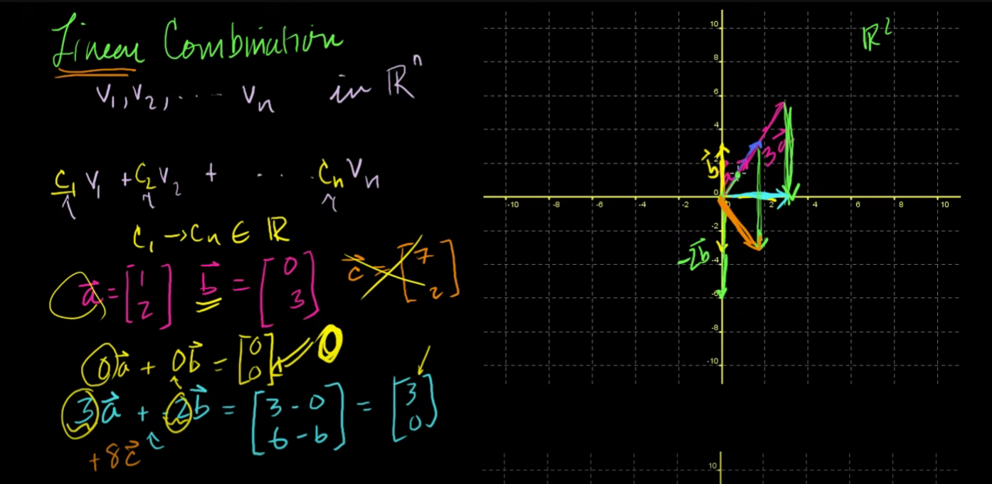 1. 선형결합(Linear Combination) 선형대수학 전반에서 등장하는 선형결합에 대해서 알아보겠다. 벡터의 선형결합이라는 것은 말 그대로 벡터들을 단순히 다 더하는 것이다. n차원 상의 벡터가 m개만큼 존재할 때, v1~vm까지 임의의 상수를 곱해서 더하는 것이다. 구체적인 예시를 들어보면 아래와 같다. 벡터 a는 (1,2), 벡터 b는 (0,3)이라고 한다면, 임의의 c1과 c2를 곱해서 새로운 벡터를 만들어 낼 수 있다. 이렇게 만들어진 벡터들을 R²위에 표현하면, 어떤 벡터든 a와 b의 선형결합으로 나타낼 수 있다. 결론적으로 Span(a, b)는 R²라고 할 수 있다. 하지만, 어떤 두 벡터가 있더라도 R²의 모든 벡터를 나타낼 수 있는 것은 아니다. a와 b가 영벡터이거나, 동일한 직선..